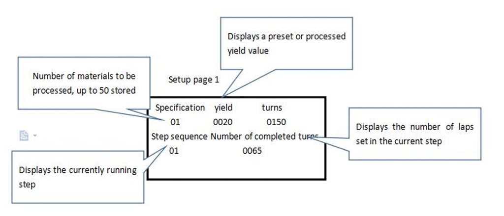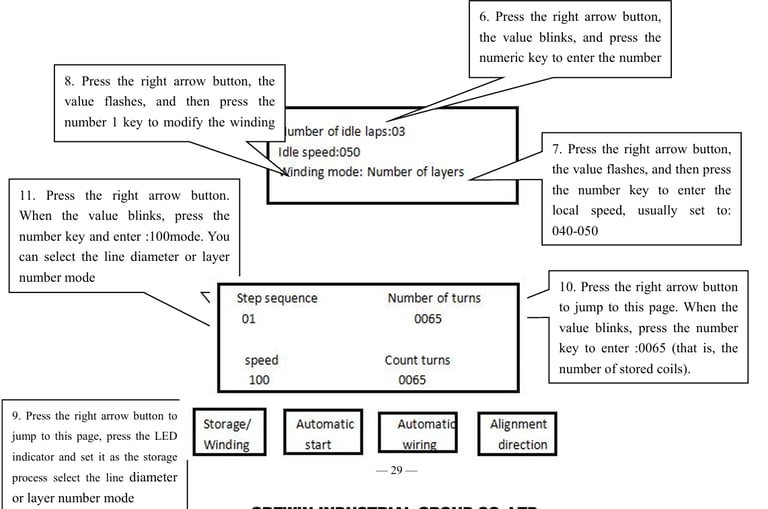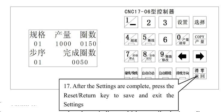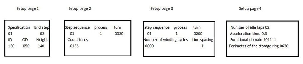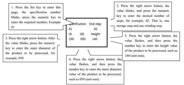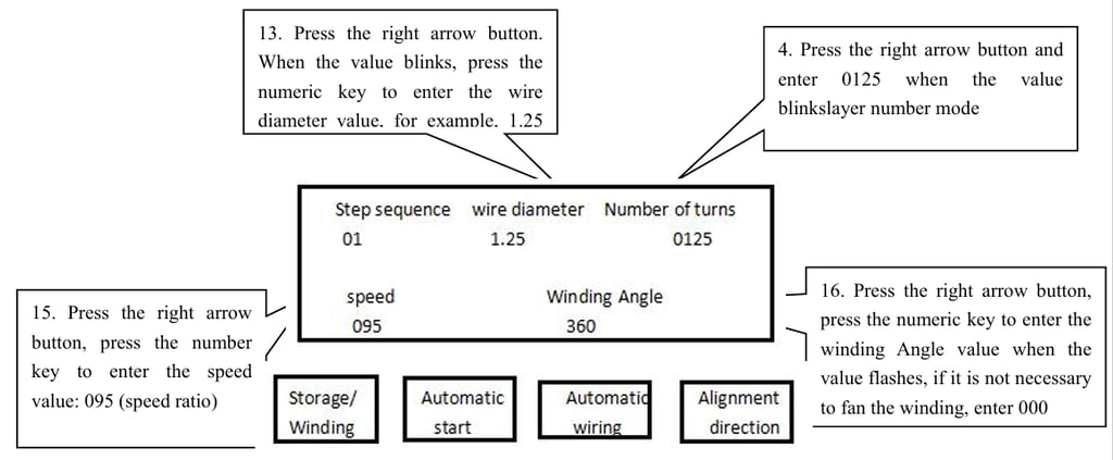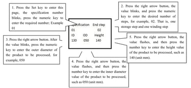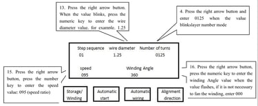 Note: The calculation of the number of turns needs to be automatically calculated according to the winding value set at the back, so usually skip the setting of step 01 first, after setting the winding step at the back, and then return to the calculation value displayed on this page to enter the number of stored coils.