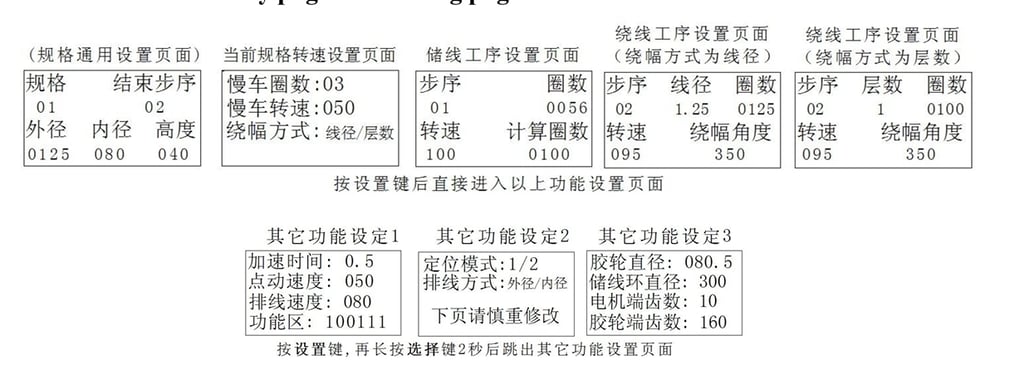 1. When setting the storage coil value, you can skip the step setting page first, because the new controller has the function of automatically calculating the number of storage coils, the premise is that you need to set the following winding step coil value, and then return to the storage wire step page, the value below the calculation of the number of coils is the automatic calculation of the number of storage coils, and then refer to the value of the manual input to the number of turns. (The calculated value will cause errors due to the different number of winding coils and lead length, you can try to wind one and then enter the setting state to correct it)