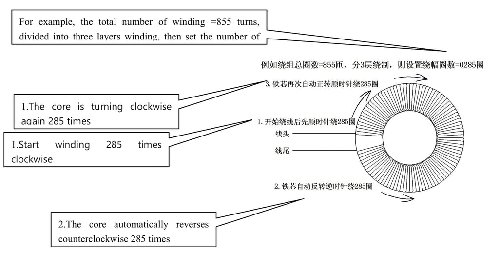 6. Winding mode: wire diameter/number of layers set the arrangement of the coil on the iron core. When set to wire diameter, the iron core moves anAngle according to the size of the preset wire diameter each time it is wound; When set to the number of layers, the rotation Angle of the iron core is automatically distributed evenly according to the preset number of layers/turns and the winding Angle.